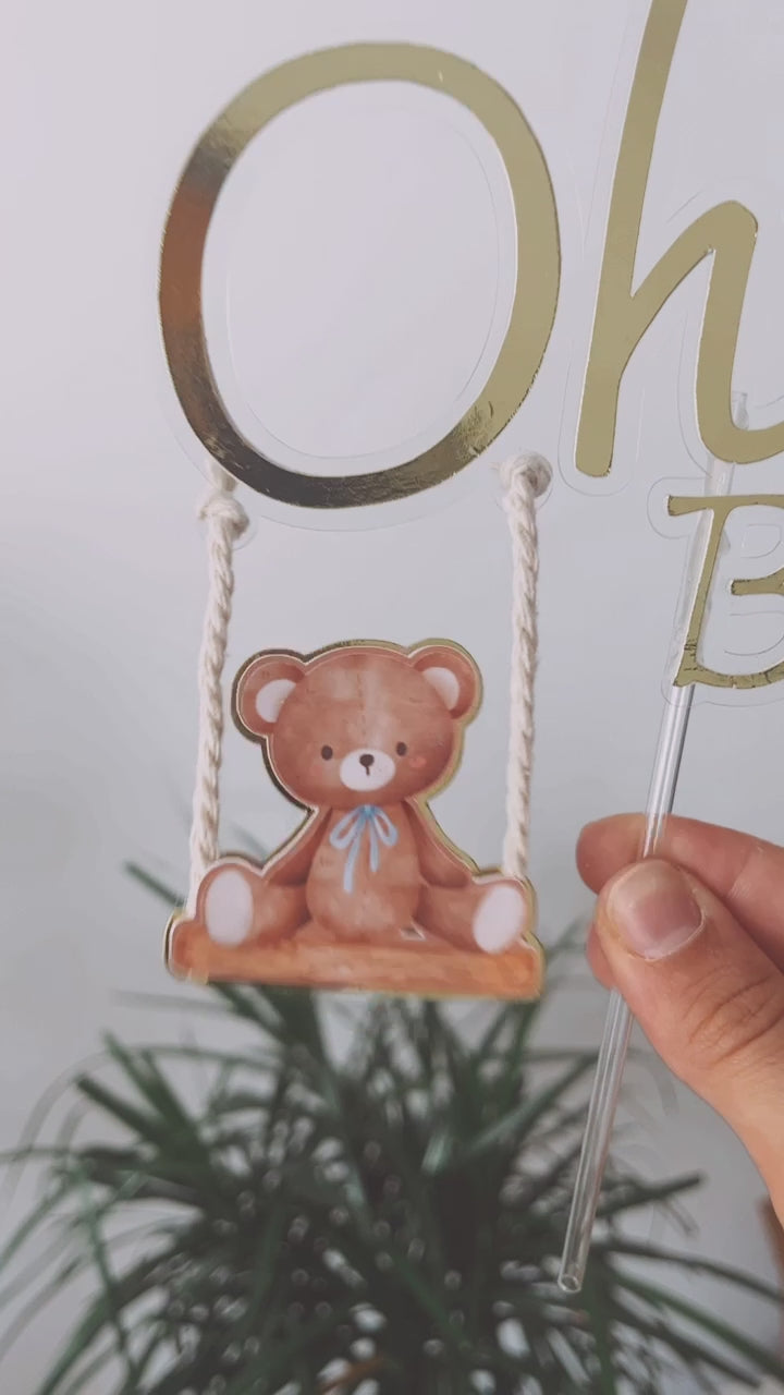 Topo de bolo "Oh baby" de duas camadas para baby shower com ursinho no baloiço.